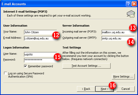 | 12)Enter your name and e-mail address (Note: the name you enter here will be displayed in all outgoing email messages). | ||||